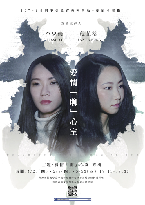 諮商中心這學期舉辦的「性別平等教育系列活動—愛情沙塵『抱』」進入最終章—由諮商中心芷榕老師、思儀老師所帶領的「愛情『聊』心室」於4/25、5/9、5/23,三個週四晚上19:15-19:30在諮商中心FB粉絲頁開播,以現今最火紅的直播方式在校園中展開 power! ...More