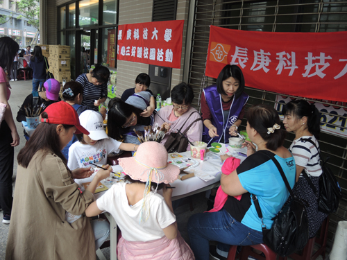 家族同學於4月21日至文青里A7社區參加『拒菸健走 健康找我』擺攤活動,以「色彩小學堂」的彩繪遊戲和社區民眾進行互動,由同學運用美術專業指導彩繪,除了增進民眾對色彩的認識,並培養色彩應用與訓練繪畫技巧,過程中由家長陪伴小孩彩繪,凝聚親子感情,強化了學校與社區民眾的良好互動,深耕社區服務。(服務學習中心/曾紀明)